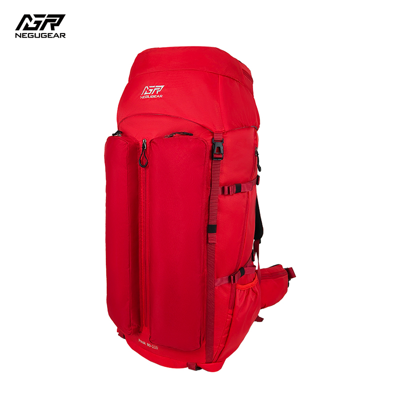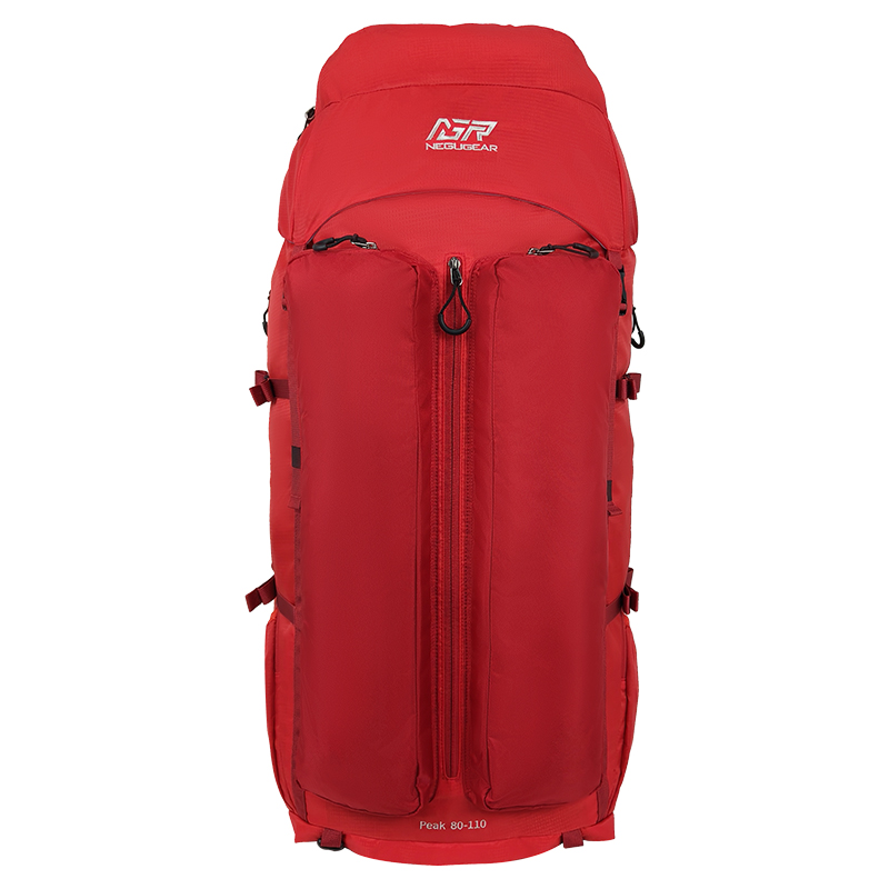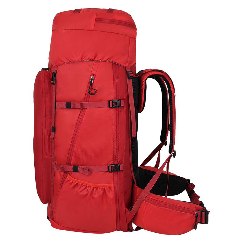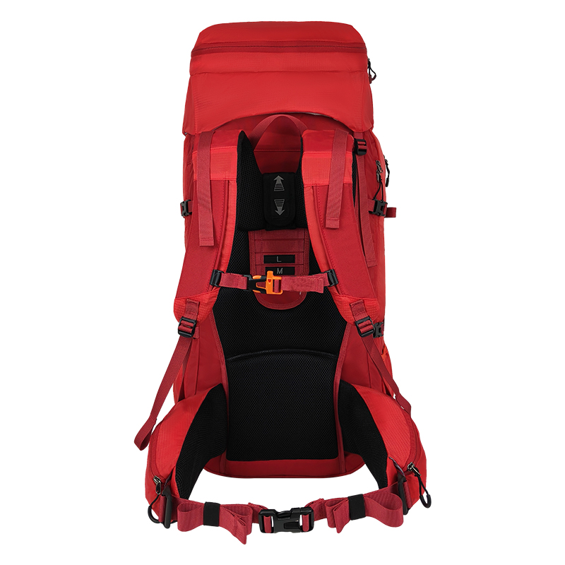 Designed for heavy-duty hiking, fabric: high-density nylon, water-repellent and tear-resistant lining: polyester, mesh bag: polyester, rain cover: polyester fabric, buckles: YKK, zipper: YKK, webbing: nylon webbing, independent bag compartment on the top, a main compartment on the front, zipper openings on the bottom of the left and right sides directly into the main compartment, Velcro-type height-adjustable backrest with three adjustment levels of S, M, and L, breathable backrest, adjustable length with waist bag waist piece, bottom rain cover pocket, 2 built-in aluminum bars for support, chest buckle for survival whistle, left and right adjustable waist belt, bottom tent moisture-proof pad fixing webbing.